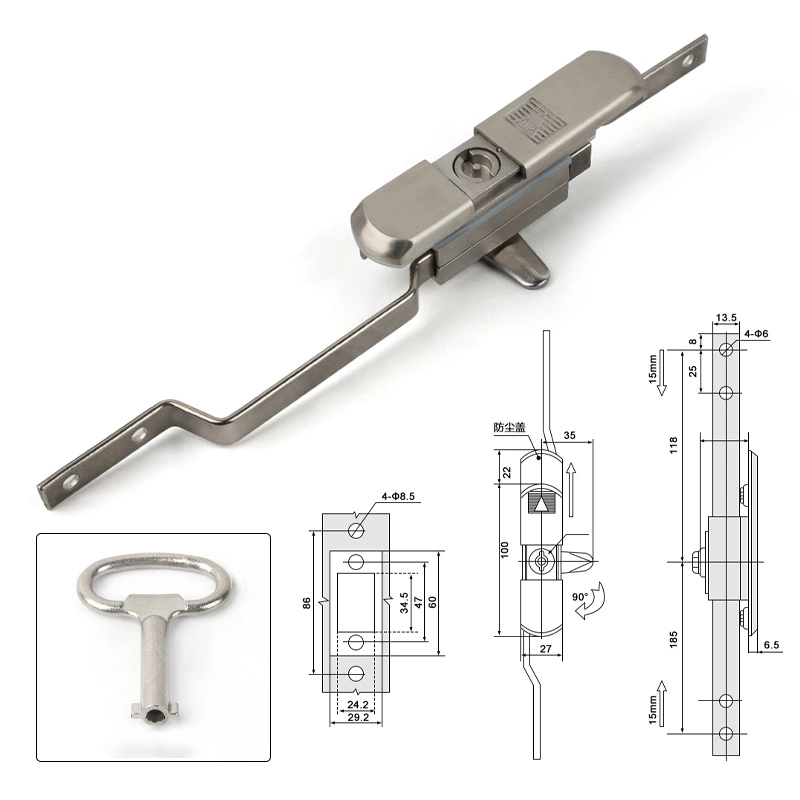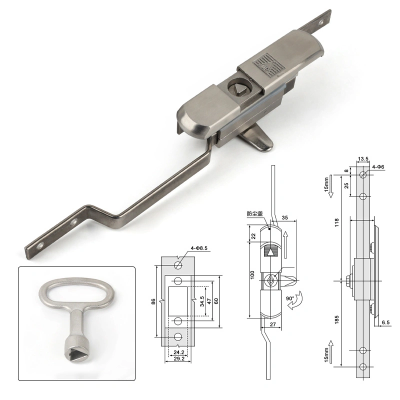 Ang pag -andar ng lock na ito ay upang ma -secure ang mga pintuan ng gabinete sa pamamagitan ng isang mekanismo ng vertical rod, na nagbibigay ng komprehensibong proteksyon para sa mga de -koryenteng cabinets o mga rack ng server. Ang disenyo ng produkto ay katugma sa mga rittal cabinets at karaniwang mga katawan ng gabinete, at ang pag -install ay hindi nakakaapekto sa istraktura ng pinto. Nagtatampok ang lock body ng isang takip ng alikabok para sa pinasimple na pagpapanatili.