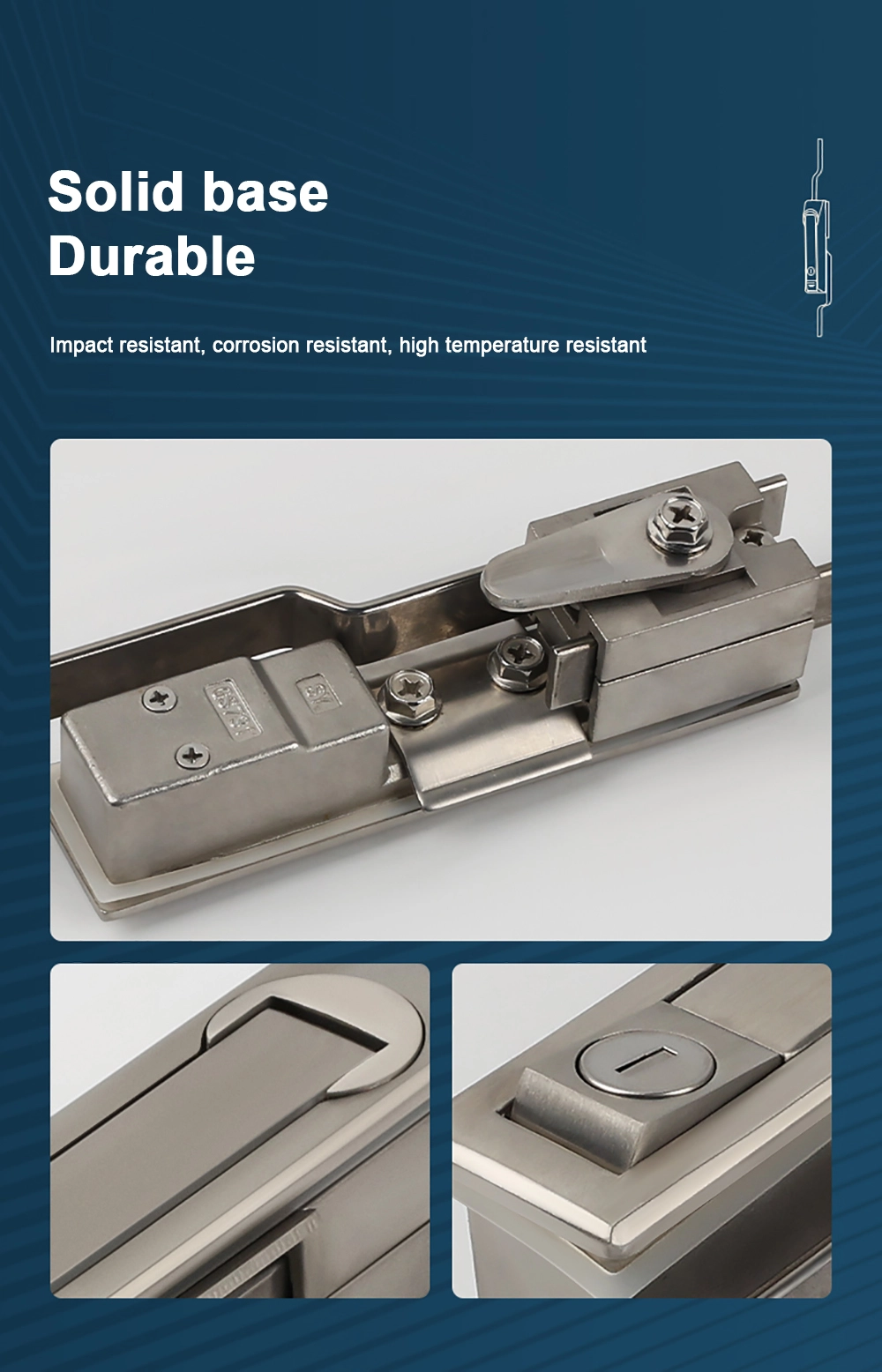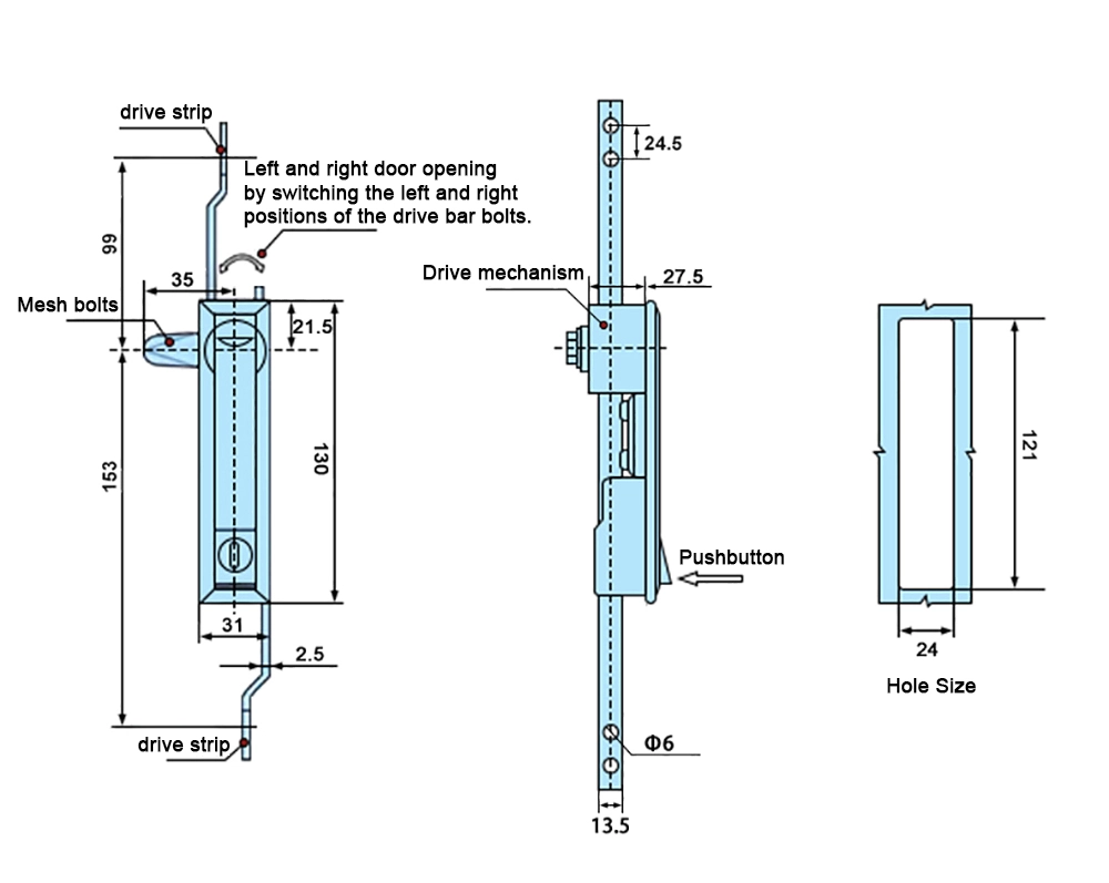 Ang hindi kinakalawang na bakal na lock ng pinto ay gawa sa hindi kinakalawang na asero sa orihinal na hindi kinakalawang na kulay ng asero para sa tibay at paglaban sa kaagnasan. Ang laki ng pagbubukas ay 24 mm × 121 mm, tinitiyak ang pagiging tugma sa mga karaniwang pag -install ng pag -install.