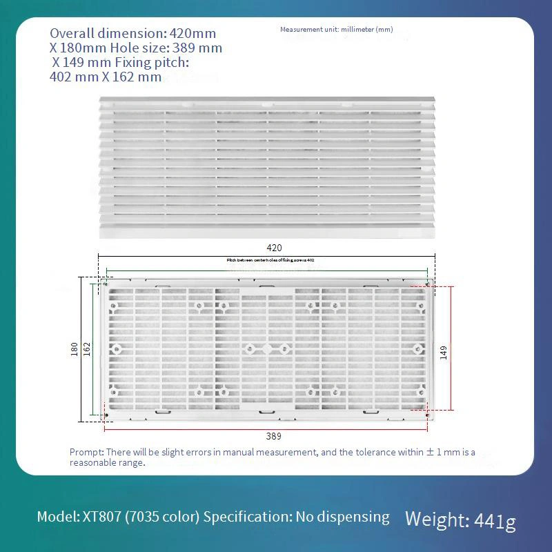 Nagtatampok ng isang maaaring kapalit ng disenyo ng filter mesh para sa madaling pang-araw-araw na pagpapanatili at kapalit, makabuluhang binabawasan ang pangmatagalang mga gastos sa operating. Ang istraktura ng frame ay magagamit sa isang karaniwang kulay na puting-kulay-abo na 7035. Ito ay itinayo mula sa isang materyal na ABS na nag-aalok ng mahusay na paglaban sa pagpapapangit, tinitiyak ang pangmatagalang katatagan.